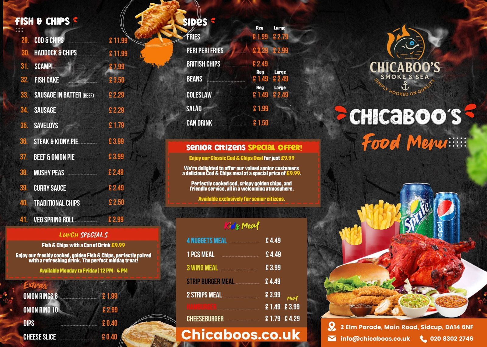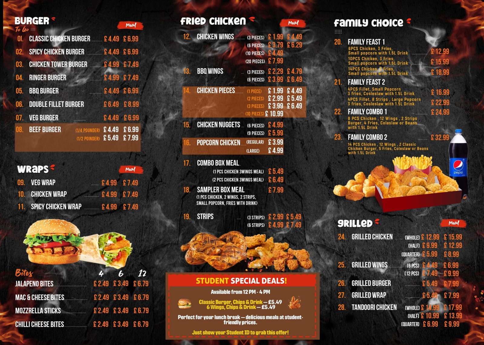 - BURGER GRILLED CHICKEN WRAP FISH & CHIPS SIDES KIDS MEAL FRIED CHICKEN